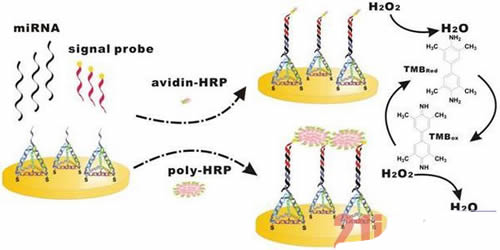 在樊春海研究員指導(dǎo)下,聞艷麗等科研人員將這種DNA納米結(jié)構(gòu)修飾表面用于microRNA的傳感檢測(cè)。研究表明,這種新型的生物傳感器可以檢測(cè)到aM(10-18 mol/L)水平(<1000個(gè)分子)的microRNAs,具有良好的單堿基區(qū)分能力,且能與前體RNA很好地區(qū)分。