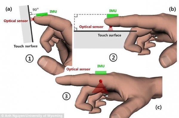 所有這些定位數(shù)據(jù)將被傳送到筆記本中,然后以此移動(dòng)光標(biāo)。使用者還可以用觸摸屏式的動(dòng)作進(jìn)行控制,如用手指雙擊或長按等。通過整合所有傳感器的數(shù)據(jù),3DTouch可以更準(zhǔn)確地在屏幕上定位。研究者稱,3D Touch在移動(dòng)三維物體時(shí)的誤差只有1毫米。在不同的手指上戴上多個(gè)3D Touch裝置,還可以進(jìn)行多點(diǎn)觸摸的操作。