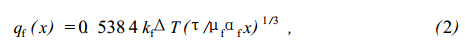 式中X為流過熱源表面的距離,m+ kf為流體的熱導(dǎo)率, W.K-1.m-1,為黏度系數(shù),kg m-1 s- + af為熱擴(kuò)散率,