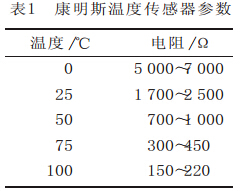 電控柴油發(fā)動機上使用的溫度傳感器為二線式熱敏式溫度傳感器, 其外形如圖2所示。隨著溫度的升高, 熱敏電阻的阻值降低, 正常情況下阻值在500Ω~40kΩ之間變化, 表1所示為一個典型的康明斯溫度傳感器參數(shù), 具體參數(shù)值請參照隨電路圖提供的傳感器技術參數(shù)表。圖3為溫度傳感器的工作原理圖。隨著溫度的升高, 熱敏電阻值降低, 從而使信號電壓降低, 根據(jù)溫度傳感器的工作原理, 可以用檢查熱敏電阻阻值的方法檢查溫度傳感器, 通過對比實際測量所得的電阻值和參數(shù)表中的電阻值, 來判斷溫度傳感器是否正常。