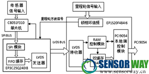 系統(tǒng)總體邏輯設(shè)計框圖如圖3所示。系統(tǒng)運行過程中,里程輪會隨著檢測器運行的距離變化發(fā)出周期性的方 波信號,主控FPGA通過倍頻的方式使其滿足設(shè)計要求的 采樣頻率,并行發(fā)送至前端數(shù)據(jù)采集系統(tǒng),確保前端各單片 機同時進行A/D轉(zhuǎn)換。探頭內(nèi)由單片機負責(zé)依次A/D轉(zhuǎn) 換5只霍爾傳感器感應(yīng)到的磁通信號,通過SPI總線將采 集到的數(shù)據(jù)發(fā)送回集束器端的FPGA;5組集束器端的FP-GA通過LVDS串行收發(fā)器同時將前端數(shù)據(jù)發(fā)送到主控FP-GA,當(dāng)主控FPGA內(nèi)部緩存滿后,發(fā)送使能信號到PCI9054 橋芯片,通知PC104工控機讀取FPGA的內(nèi)部緩存數(shù)據(jù),并 將數(shù)據(jù)及時存儲到固態(tài)硬盤設(shè)備中。