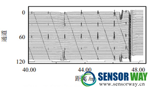 圖5為通過軟件分析得出的40.00~48.00m的其中120路管道漏磁檢測原始數(shù)據(jù)圖,橫軸